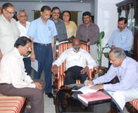AMU VC (centre) looks on as Prof Ashhar signs the documents before leaving for Murshidabad