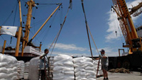 Workers load supplies on the Moldova-flagged cargo ship named "Amalthea" at the port of Lavrio, about 60 kilometers (37 miles) southeast of Athens, on Friday