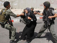 STANDING FOR ARAB RIGHTS Israeli policemen scuffle with a Palestinian woman at Qalandiya checkpoint near the West Bank city of Ramallah during a demonstration on Saturday