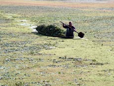 "Some of the so-called weed harvesters, half sunk in the lake, are