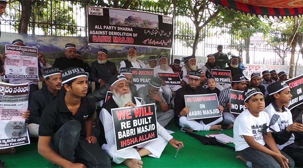 Carrying black flags and holding placards, the Muslims protesters gathered at various places including New Delhi, Mumbai, Malegaon and Hyderabad prayed that the mosque is built at its original place.