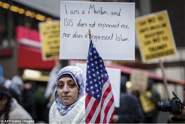 Many Muslim demonstrators carried signs saying that they are not terrorists and should not be associated with terrorist groups such as ISIS.