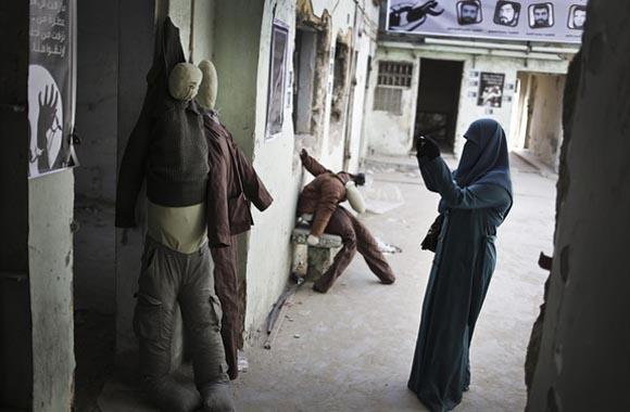 [A palestinian veiled woman takes photos of dummies representing Palestinian prisoners in Saraya prison that was formerly used by Israeli security.]