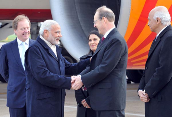 Modi was received at Heathrow International Airport, among others, by British Minister of State for the Foreign Commonwealth Office Hugo Swire, British High Commissioner to India James David Evan, Indian High Commissioner to Britain Ranjan Mathai, and British Minister of State for Employment Priti Patel, who is of Indian origin.