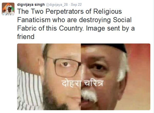 "The two perpetrators of religious fanaticism who are destroying social fabric of this country," tweeted Digvijaya Singh while posting the image, which he said was sent by a friend.