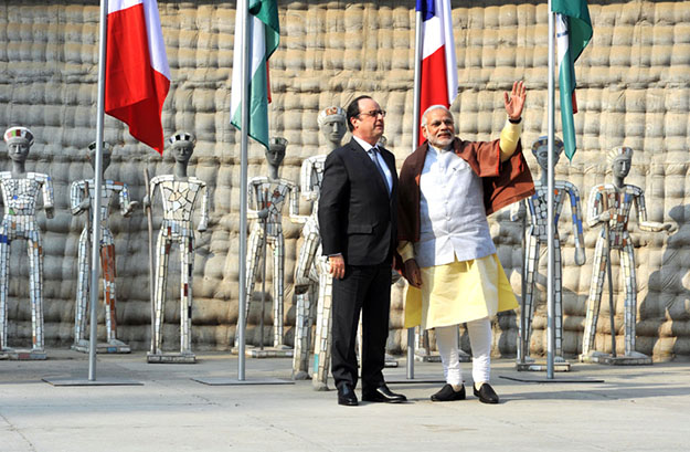 [Prime Minister Narendra Modi with the President of France Francois Hollande, at Nek Chand Rock Garden, in Chandigarh on January 24, 2016.]