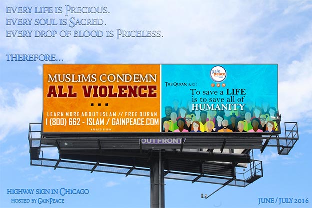 Besides condemning violence, these billboards offer the public an opportunity to call GainPeace’s outreach hotline to ask any question on Islam and request a free copy of the Qur’an in English or Spanish.