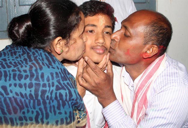 [Sarfaraz Hussain with parents after results were declared on Tuesday.]